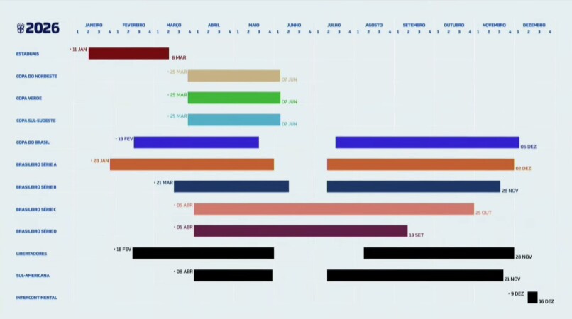 A CBF anunciou, nesta quarta-feira (1º), o novo calendário do futebol brasileiro para o ciclo 2026-2029. Em evento realizado na sede da entidade, no Rio de Janeiro, o presidente Samir Xaud revelou os motivos que levaram às mudanças. Já o diretor de competições, Júlio Avelar, detalhou as novas datas e formatos das principais competições nacionais a partir do próximo ano.