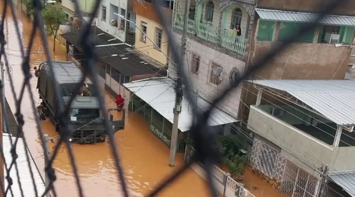 Imagens cedidas à Itatiaia mostram os militares trafegando em barcos e caminhões pelas ruas completamente inundadas de Matias Barbosa, um dos municípios mais afetados pelos temporais.
