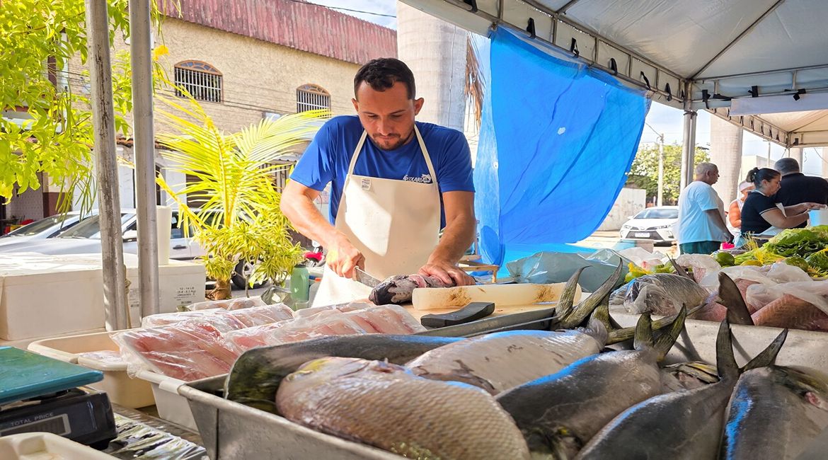 Ao todo, o evento conta com 12 bancas de pescado e seis bancas de hortaliças e hortigranjeiros, oferecendo ao público opções variadas.