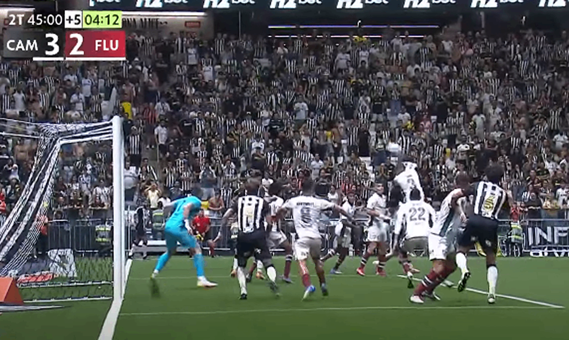 – Não vi se alguém já comentou esse lance, mas no terceiro gol do Galo, Lyanco estava em posição de impedimento quando da cabeçada de Igor Gomes. Ele salta na bola e faz com que Fábio encolha a mão (câmera de trás mostra), o que poderia configurar impedimento.